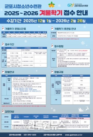 군포시청소년수련관(관장 박윤정)은 “이번 겨울학기는 군포 시민들이 새로운 배움과 여가를 함께 즐길 수 있도록 준비했다”며 “청소년은 물론 전 세대가 어울리는 따뜻한 배움터로 운영하겠다”고 말했다.