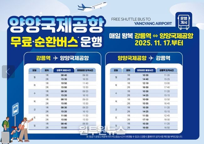 (원투원뉴스) 강릉시는 관광객과 시민의 교통편의를 높이고 글로벌 관광 접근성을 강화하기 위해 강릉역-양양국제공항 구간을 잇는 무료 광역순환버스 운행을 오는 17일부터 시작한다.