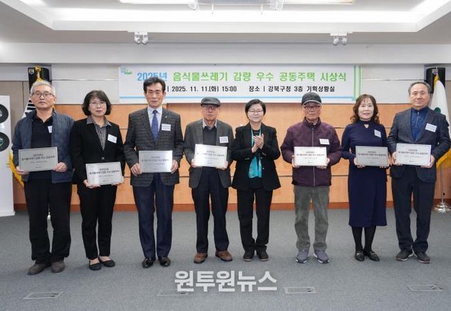(원투원뉴스) 서울 강북구는 11월 11일 구청 기획상황실에서 ‘2025년 공동주택 음식물쓰레기 감량 우수 공동주택 시상식’을 개최했다.