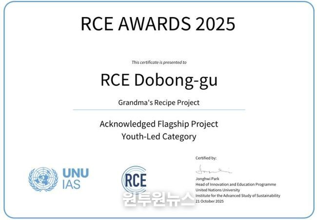 (원투원뉴스) 서울 도봉구가 ‘2025 RCE 어워드’(RCE Award)에서 ’우수 프로젝트‘(Acknowledged Flagship Project) 상을 수상했다.