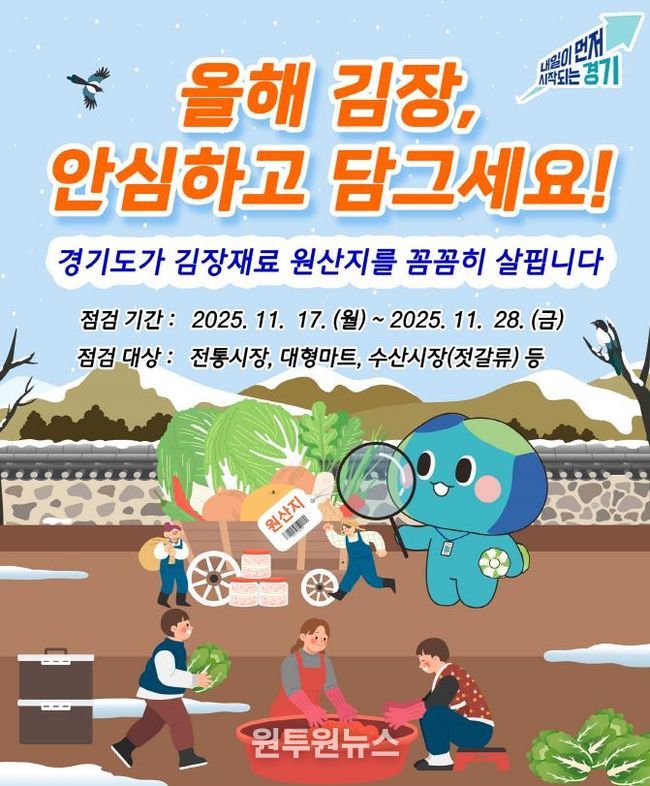 (원투원뉴스) 경기도는 김장철을 맞아 오는 17일부터 28일까지 배추김치와 김장채소 양념류에 대한 원산지표시 점검을 한다.