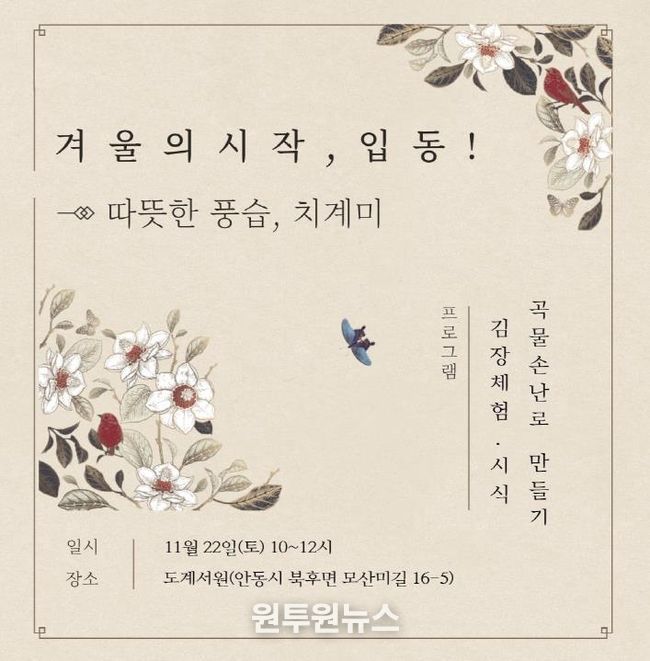 (원투원뉴스) 문화공간 도계는 오는 11월 22일, 겨울을 맞아 안동시 북후면 도계서원에서 '도계의 열두마당 세시이야기' 프로그램의 일환으로 ‘겨울의 시작, 입동! - 따뜻한 풍습, 치계미’ 체험행사를 개최한다.