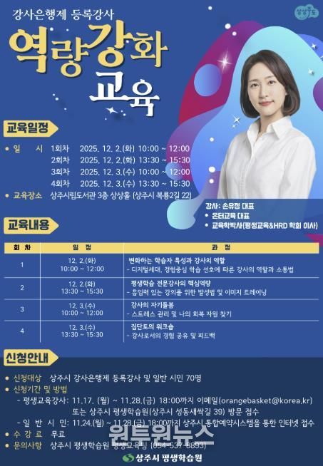 (원투원뉴스) 상주시는 11월 17일부터 11월 28일까지‘2025년 강사은행제 등록강사 역량강화 교육’수강생 70명을 모집한다.