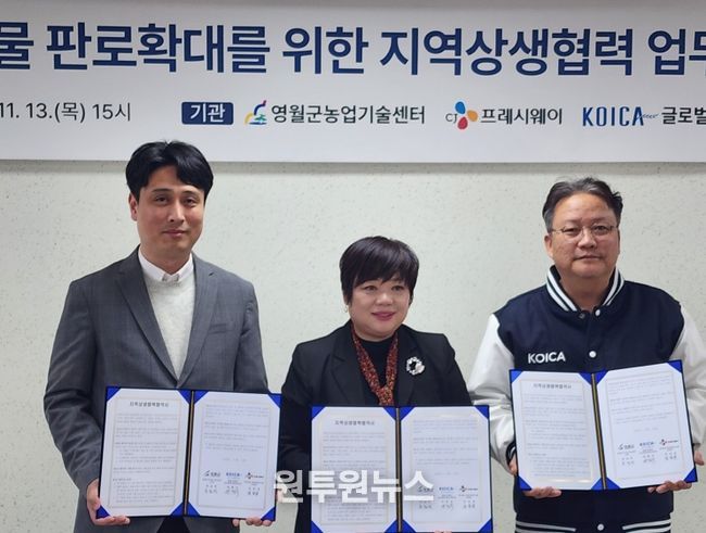 (원투원뉴스) 영월군농업기술센터는 2025년 11월 13일 목요일 오후 3시, 영월군농업기술센터 2층 회의실에서 CJ프레시웨이, KOICA글로벌인재교육원과 함께 지역상생협력 업무협약을 체결했다.
