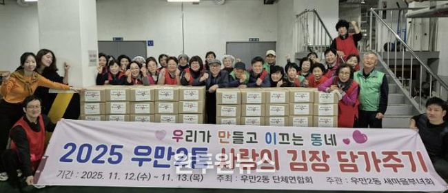 (원투원뉴스) 수원시 팔달구 우만2동은 지난 12~13일 이틀에 걸쳐 ‘2025 사랑의 김장 담가주기’ 행사를 실시했다고 밝혔다.