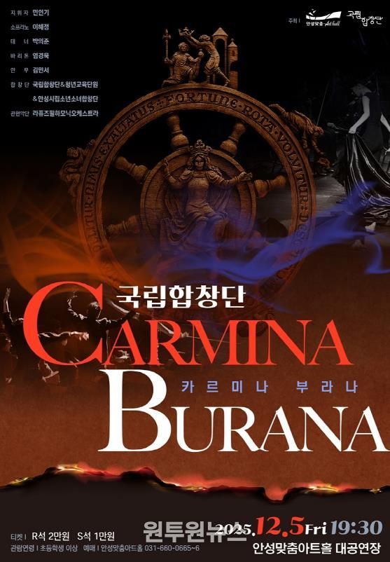 (원투원뉴스) 안성맞춤아트홀은 오는 12월 5일 오후 7시 30분, 대공연장에서 국립합창단이 선보이는 칼 오르프의 칸타타〈카르미나 부라나'를 공연한다. 이번 무대는 약 200명의 출연진이 참여하는 대규모 무대로, 안성 시민에게 웅장한 음악적 감동을 선사할 예정이다.