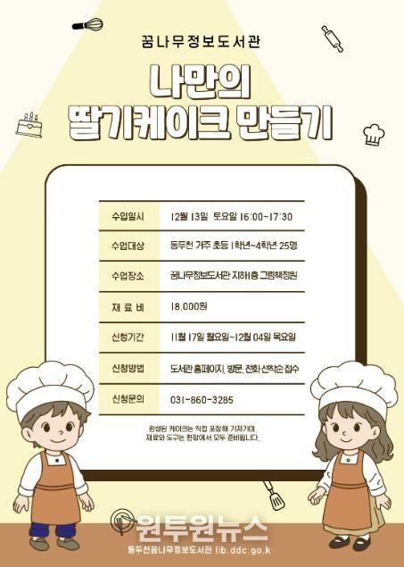 (원투원뉴스) 동두천시 도서문화사업소 꿈나무정보도서관은 오는 12월 13일 오후 4시부터 5시 30분까지 도서관 그림책 정원에서 『케이크 만들기』 원데이 클래스를 운영한다고 밝혔다.