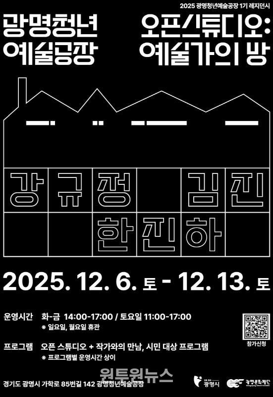 (원투원뉴스) 광명문화재단은 오는 12월 6일부터 13일까지 청년 예술인 레지던시 공간인 광명청년예술공장에서 입주 작가 오픈스튜디오 '예술가의 방'을 개최한다.