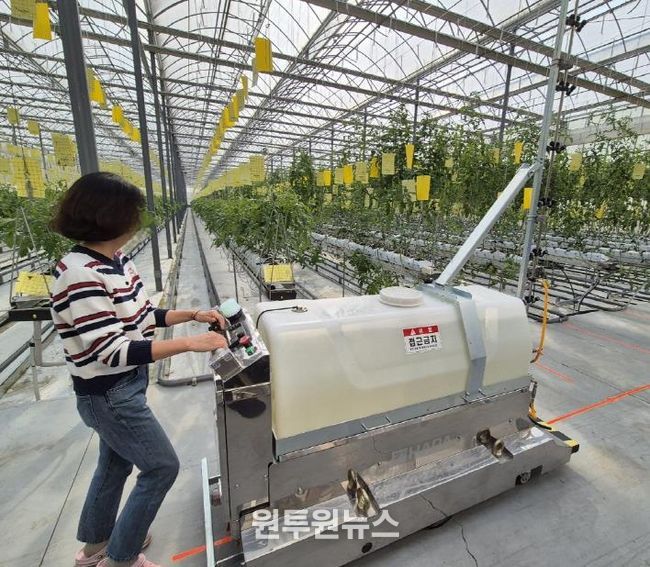 (원투원뉴스) 평택시는 농업 현장에서 반복적이고 인체에 유해할 수 있는 방제 작업의 위험을 줄이기 위해 ‘중소형 스마트팜 방제 로봇 시범사업’을 고덕면 시설토마토 농가(규모 0.4㏊)를 대상으로 추진했다.