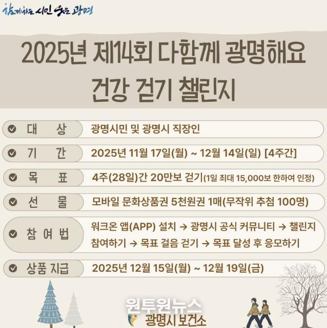 ‘제14회 다함께 광명해요 건강 걷기 챌린지’는 4주 동안 총 20만 보 걷기를 목표로 진행한다. 1일 최대 1만5천 보까지 인정하며, 참가자는 워크온 앱으로 걸음 수를 기록하고 목표를 달성하면 응모할 수 있다. 완주자 중 추첨을 통해 100명에게 모바일 문화상품권(5천 원권)을 증정한다.