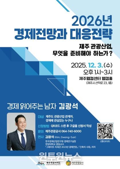 (원투원뉴스) 제주특별자치도와 제주관광공사(사장 고승철)는 ‘경제 읽어주는 남자’로 유명한 김광석 한양대학교 겸임교수를 초청, 오는 12월 3일 제주웰컴센터에서 ‘2026년 경제 전망과 대응 전략 : 제주 관광산업, 무엇을 준비해야 하는가?’를 주제로 특강을 진행한다고 14일 밝혔다.
