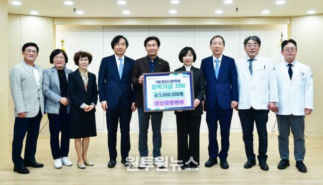 (원투원뉴스) (재)경산시장학회(이사장 조현일)는 14일 의료법인 근원의료재단 경산중앙병원(이사장 정민혜)에서 지역인재 육성을 위한 장학금 500만 원을 기탁했다고 밝혔다.