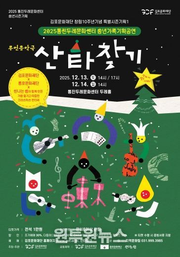 (원투원뉴스) (재)김포문화재단은 12월 13일 오후 2시, 5시, 14일 오후2시 통진두레문화센터에서 2025년 송년 공연 기획공연 선물 1 '산타찾기'를 총 3회에 걸쳐 선보인다고 밝혔다. 이번 공연은 김포문화재단·종로문화재단·신나는 섬이 공동 제작한 넌버벌 음악극으로, 통진두레문화센터에서 첫 선을 보이는 작품이다.