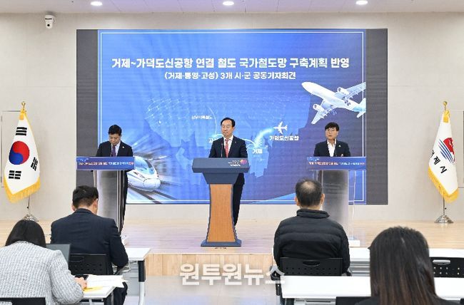(원투원뉴스) 거제시는 17일 오후 2시 거제시청 대회의실에서 통영시․고성군과 함께 ‘거제~가덕도신공항 연결철도’의 제5차 국가철도망 구축계획 반영을 촉구하는 공동 기자회견을 개최했다.