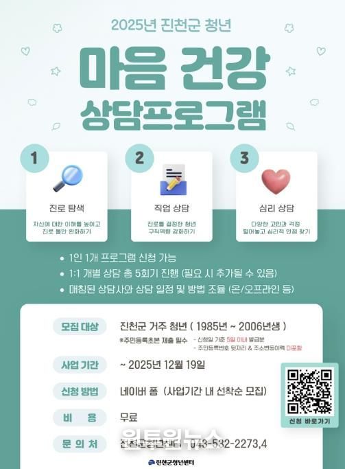 (원투원뉴스) 충북 진천군청년센터는 지역 청년들의 심리적 안정과 진로 고민 해소를 돕기 위해 ‘마음건강상담 프로그램’을 운영 중이라고 18일 밝혔다.