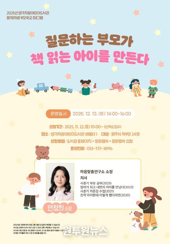 (원투원뉴스) 원주시 생각자람어린이도서관은 오는 12월 13일 오후 2시, 마음맞춤연구소 안정희 소장을 초청해 ‘질문하는 부모가 책 읽는 아이를 만든다’를 주제로 12월 ‘함께자람 부모학교’ 프로그램을 운영한다.