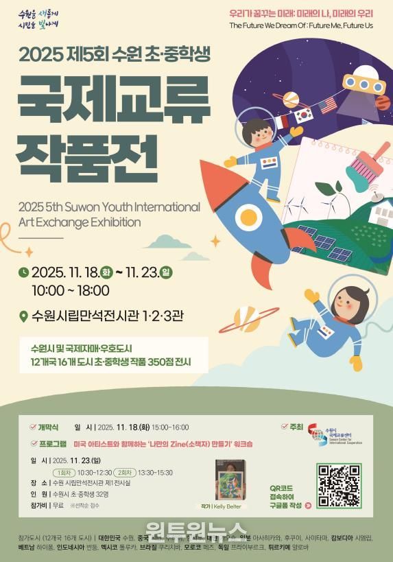 ‘우리가 꿈꾸는 미래’를 주제로 열리는 ‘2025 제5회 수원 초·중학생 국제교류 작품전’에서는 세계 각국의 청소년이 미래 사회와 자신이 꿈꾸는 삶을 표현한 작품을 선보인다. 수원시국제교류센터가 주최한다.
