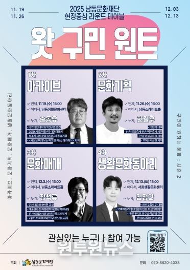 (원투원뉴스) 인천시 남동구 남동문화재단은 아카이브·문화기획·문화매개·생활문화동아리 4개의 주제로 구민·예술인·유관기관 현장의 목소리를 직접 듣고 문화 수요 데이터를 수집하는 라운드 테이블 ‘왓 구민 원트: 구민이 원하는 문화’ 시즌2를 진행한다고 18일 전했다.