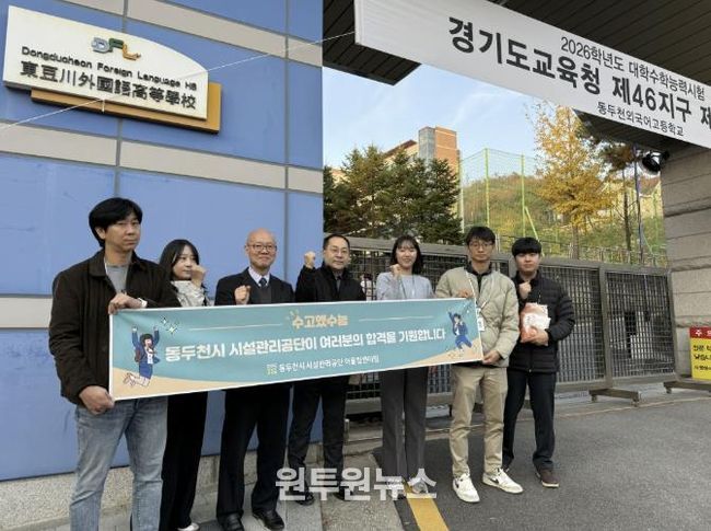 (원투원뉴스) 동두천시 시설관리공단은 11월 13일 2026학년도 대학수학능력시험을 마치고 시험장을 나오는 수험생들을 격려하기 위해 동두천외국어고등학교 앞에서 ‘수고했수능’ 응원 행사를 진행했다.