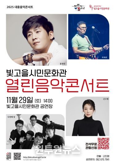 (원투원뉴스) 광주문화재단은 오는 11월 29일 빛고을시민문화관 공연장에서 ‘2025 대중음악콘서트(2회차)’를 전석 무료로 개최한다고 밝혔다. 이번 공연은 시민 문화복지 실현과 문화 접근성 확대를 위한 열린 음악회로, 지역민 누구나 부담 없이 참여할 수 있는 공공기획 공연이다.