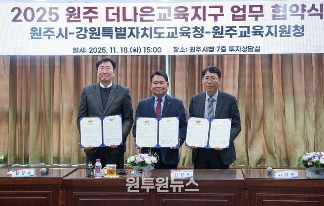 (원투원뉴스) 강원특별자치도교육청은 원주시, 원주교육지원청과 11월 18일 원주시청에서 ‘원주 더나은교육지구 연장지정 업무협약’을 체결했다.