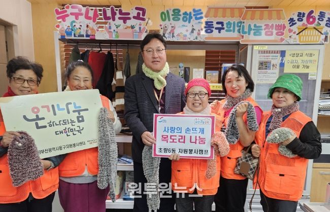 (원투원뉴스) 부산 동구 초량6동자원봉사캠프지기 회원들은 지난 14일, 동구 희망나눔점빵 초량6동점에 직접 만든 손뜨개 목도리 20개를 기부하며 따뜻한 나눔을 실천했다.