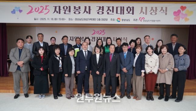 (원투원뉴스) 경상남도는 18일 경남여성가족재단 대강당에서 ‘2025 자원봉사 경진대회 시상식’에서 지역사회 자원봉사 활성화에 기여한 29개 팀에 도지사상을 수여했다고 밝혔다.