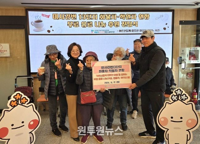 (원투원뉴스) 하남시미사강변종합사회복지관은 11월 17일 오전 10시부터 오후 5시까지, 미사강변 13단지 화물차·학원차 연합의 후원으로 복지관 내 ‘나눔카페’에서 지역 어르신들에게 커피, 전통차, 허브티 등 따뜻한 음료 400잔을 무료로 제공했다.