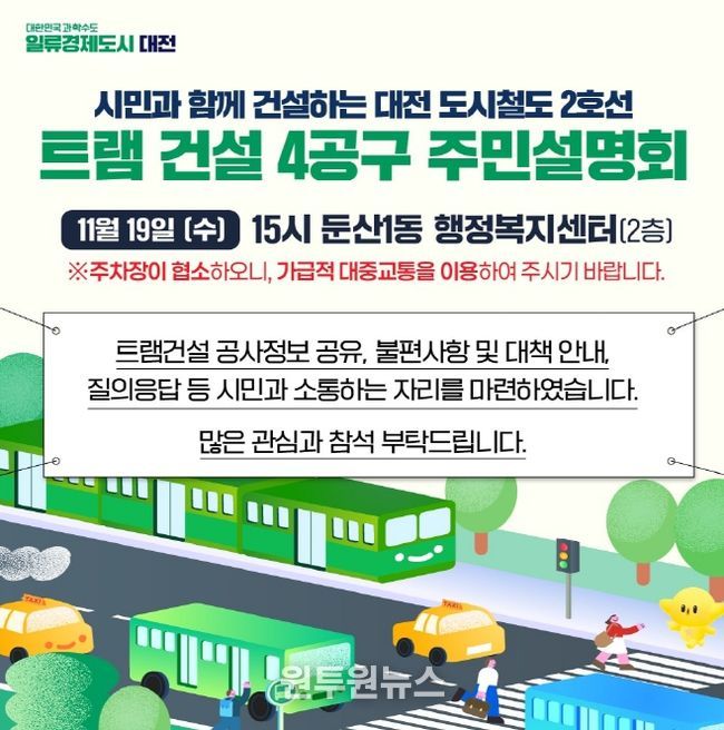 (원투원뉴스) 대전시는 19일 오후 3시 둔산1동행정복지센터에서 도시철도 2호선 4공구(수정타운아파트~대전둔산경찰서) 건설공사와 관련한 주민설명회를 개최했다.