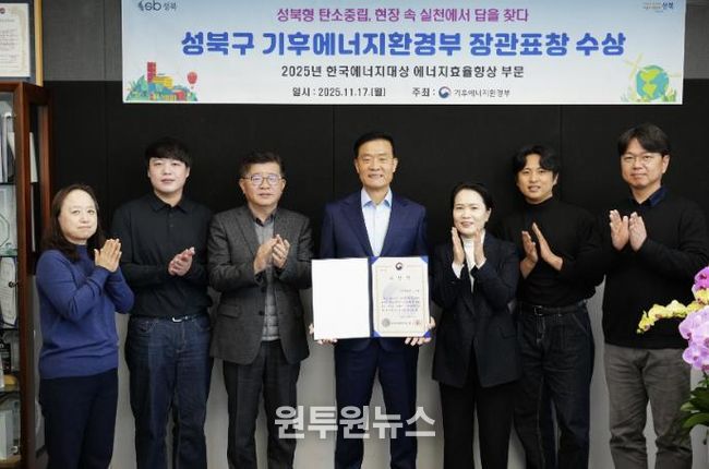(원투원뉴스) 서울 성북구가 지난 17일 더플라자 서울 호텔에서 열린 '2025년 한국에너지대상 시상식'에서 에너지 절약 및 효율 향상 유공 부문 기후에너지환경부 장관 표창을 받았다. '한국에너지대상'은 국가 에너지 효율 향상과 온실가스 감축에 기여한 기관, 단체, 개인에게 수여되는 국내 최대 규모의 에너지 분야 포상으로, 이번 수상은 성북구가 추진한 주민 참여형 에너지 절약 정책과 탄소중립 실천 노력이 전국적으로 높은 평가를 받은 결과다.