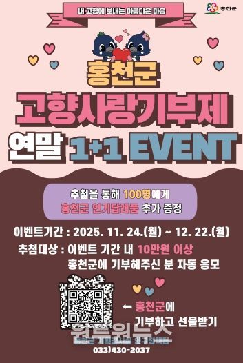 (원투원뉴스) 홍천군은 연말을 맞아 고향사랑기부제 참여 활성화를 위해 11월 24일부터 12월 22일까지 4주간 ‘고향사랑기부제 연말 1+1 이벤트’를 운영한다.