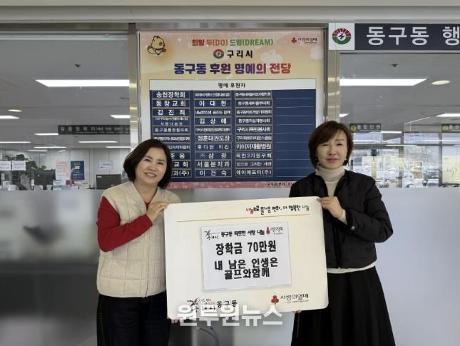 (원투원뉴스) 구리시 동구동 행정복지센터는 지난 18일 동구동 행정복지센터 대회의실에서 '내 남은 인생은 골프와 함께' 모임으로부터 관내 취약계층 청소년을 위한 장학금 70만 원을 기탁받았다고 밝혔다.