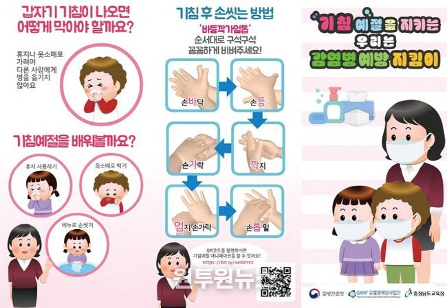(원투원뉴스) 충남교육청은 학교 현장의 감염병 대응 역량을 강화하고 학생들의 건강한 학교 생활을 지원하기 위해 “호흡기 감염병 예방을 위한 ‘5대 예방수칙’ 전단지를 배포했다고 밝혔다.