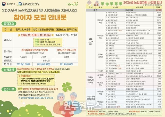 (원투원뉴스) 양주시가 오는 12월 8일부터 10일까지 3일간 ‘2026년 노인일자리 및 사회활동 지원사업’ 참여자 2,710명을 모집한다.