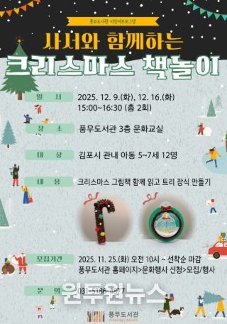 (원투원뉴스) 김포시 풍무도서관은 ‘사서와 함께하는 크리스마스 책놀이’프로그램을 12월 9일과 16일 오후 3시부터 4시 30분까지 운영한다.
