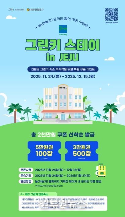 할인 대상은 제주지역 그린키 인증 숙소로 한정되며, 투숙 가능 기간은 2026년 1월 31일까지다.