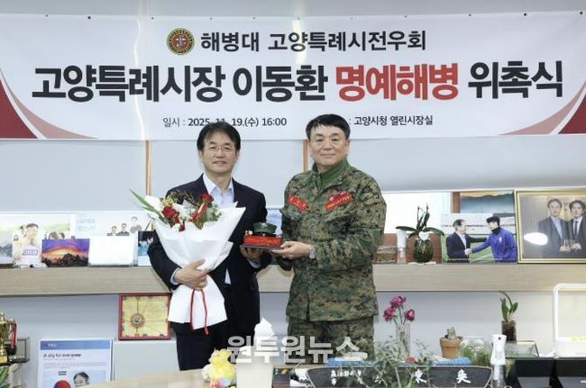 (원투원뉴스) 고양특례시는 지난 19일, 열린시장실에서 해병대 고양특례시 전우회 주관‘이동환 고양특례시장 명예해병 위촉식’을 개최했다고 밝혔다.