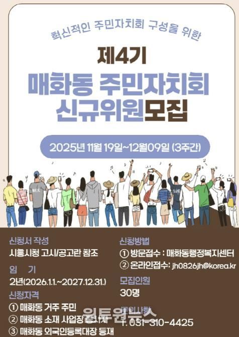 (원투원뉴스) 시흥시 매화동 행정복지센터는 12월 9일까지 ‘제4기 매화동 주민자치회’ 신규위원 30명을 공개 모집한다. 신청은 매화동 행정복지센터 방문 또는 전자우편을 통해 가능하다.