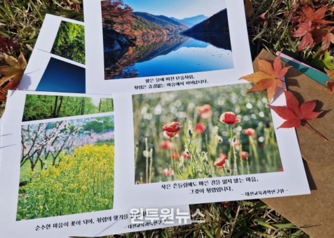 (원투원뉴스) 대전시교육청 대전교육과학연구원은 11월 21일부터 23일까지 기관장이 직접 촬영한 사진으로 제작한 ‘청렴엽서’를 배포해 교직원과 학생 및 학부모, 인근 유관기관과 함께하는 감성 청렴캠페인을 추진한다고 밝혔다.
