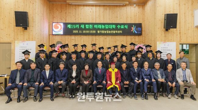 (원투원뉴스) 합천군은 11월 19일 황가람 농업농촌활력센터에서 제19기 새 합천 미래농업대학 수료식을 개최했다. 행사에는 수료생과 기관·단체장 등 63명이 참석해 지난 9개월간의 교육 성과를 함께 축하했다.