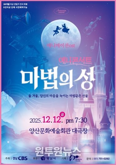 (원투원뉴스) 양산시가 후원하고 (재)경남CBS가 주최하는 어린이를 위한 '애니메이션 OST 음악회 '마법의 성''이 12월 12일 오후 7시 30분 양산문화예술회관 대공연장에서 개최된다.