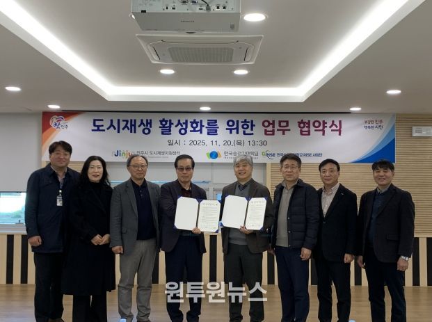 (원투원뉴스) 진주시 도시재생지원센터는 20일 지역혁신청년센터(진주시 상대동 소재)에서 한국승강기대학교와 도시재생사업의 성공적인 추진과 미래 인재 발굴, 지역 발전을 위한 협력 네트워크를 구축하기 위해 업무 협약을 체결했다.