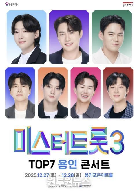 (원투원뉴스) 용인문화재단은 오는 12월 27일부터 28일까지 용인포은아트홀에서 ‘미스터트롯3 TOP7 콘서트’를 선보인다. 공연은 27일 오후 1시·6시, 28일 오후 1시 총 3회 진행된다.