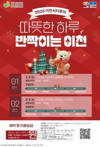 (원투원뉴스) 이천시는 오는 12월 12일부터 20일까지 매주 금·토요일, 겨울철 야간 관광의 매력을 담은 기획 시티투어 ‘따뜻한 하루 반짝이는 이천, 12월 시티투어’를 운영한다.