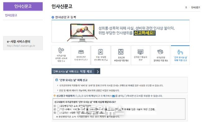 인사혁신처는 ‘간부 모시는 날’ 피해 익명 신고센터를 전자인사관리시스템(e-사람) 내 설치하고, 중앙행정기관 소속 공무원을 대상으로 피해 접수를 시작했다고 21일 밝혔다.
