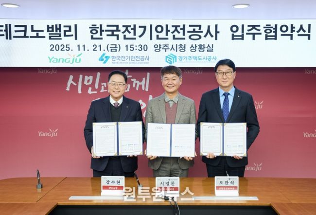 (원투원뉴스) 경기주택도시공사(GH)는 21일 양주시청 상황실에서 양주시, 한국전기안전공사와 함께 ‘한국전기안전공사 북부지역본부’의 경기양주 테크노밸리 입주를 위한 협약식을 체결했다고 밝혔다.