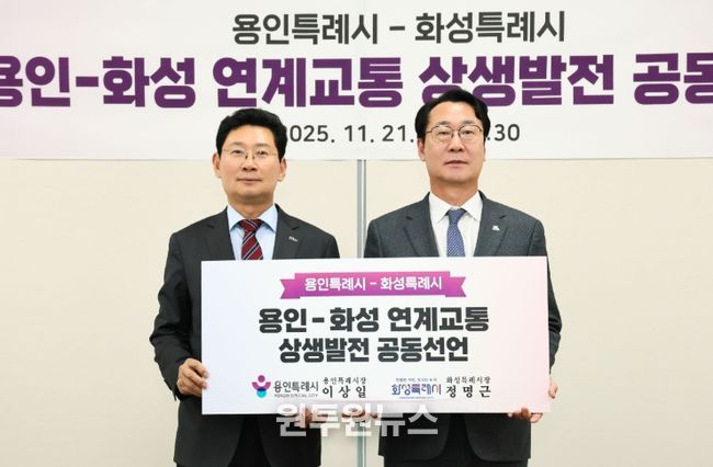 이상일 용인특례시장과 정명근 화성특례시장은 21일 오후 고양시청 백석별관에서 ‘용인~화성간 연계교통 상생발전 공동선언식’을 열고 공동선언문에 서명했다.