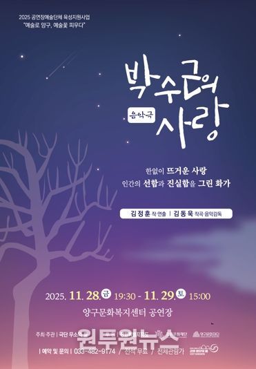 (원투원뉴스) 양구문화재단은 강원문화재단과 함께 양구의 대표 화가 박수근 화백의 사랑과 일대기를 그린 음악극 ‘박수근의 사랑’을 오는 11월 28일(19:30), 29일(15:00) 양일에 걸쳐 양구문화복지센터 공연장에서 선보인다. 본 공연은 극단 ‘무소의 뿔’이 주최·주관한다.