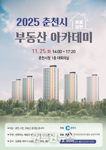 (원투원뉴스) 춘천시가 초고령화 시대에 접어들며 이슈가 되고 있는 부동산 세무의 핵심을 짚어보는 ‘2025 춘천시 부동산 아카데미’를 연다.