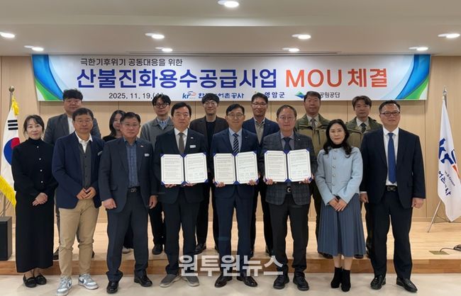 (원투원뉴스) 영암군이 19일 한국농어촌공사영암지사에서 한국농어촌공사 전남지역본부, 월출산국립공원사무소와 기후위기로 인한 대형 산불에 선제 대응하기 위해 ‘월출산 산불 진화 용수 공급사업 업무협약’을 체결했다.